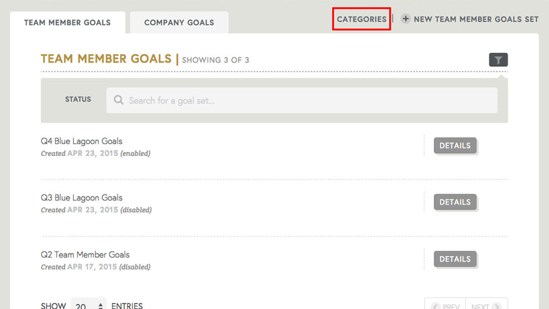Step 2: Select Categories in the upper right-hand corner of the Goals Dashboard.