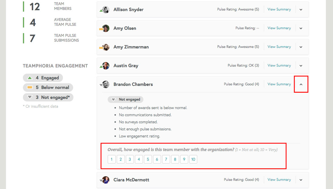Providing an Engagement Score for your Direct Report: Teamphoria also allows for managers to provide an engagement rating for their direct report as well. This rating the manager provides will also be calculated in the overall engagement score.