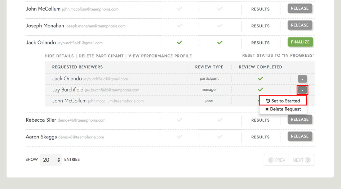 Step 4: Select the downward arrow next to the name of the employee that needs to edit their performance review responses. This can be the participant, the manager, or even a peer. Then select Set to Started.
