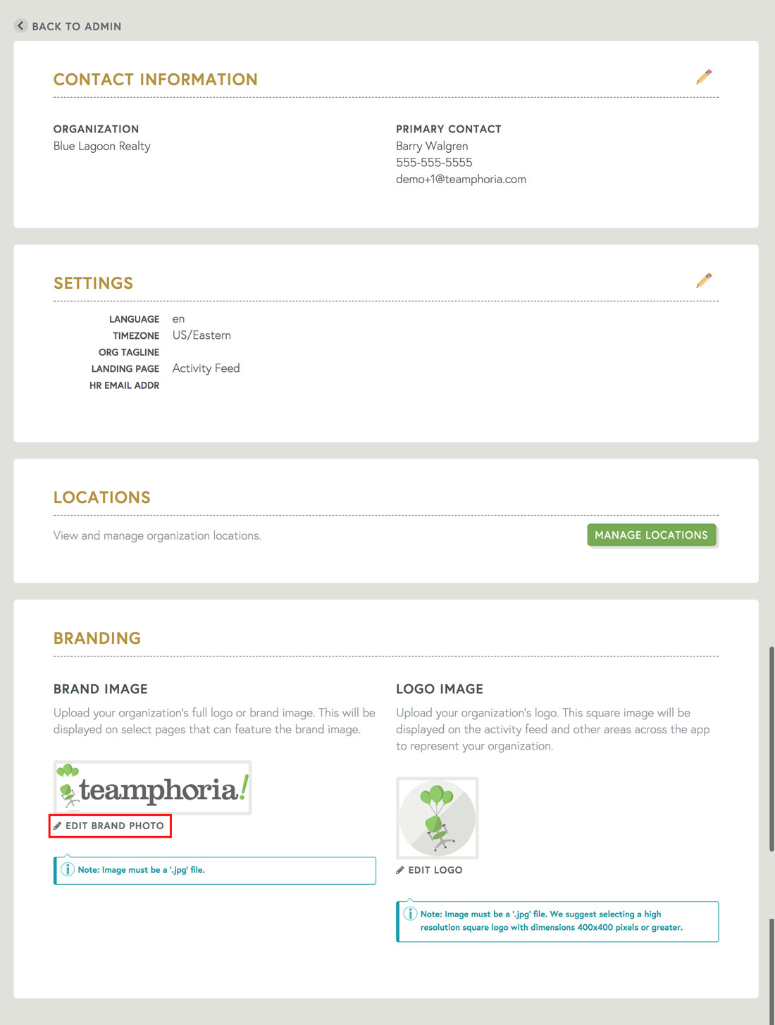 Ready to start customizing your Teamphoria account? Let's start by uploading your brand image and logo image.